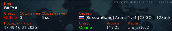 Играет на Counter Strike Global Offensive сервере. Страна: РоссияПервый раз замечен 17:33 16.01.2025