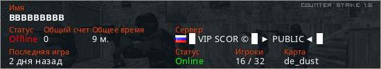 Играет на Counter Strike 1.6 сервере. Страна: РоссияПервый раз замечен 18:10 20.02.2026