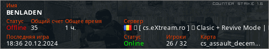 Играет на Counter Strike 1.6 сервере. Страна: РумынияПервый раз замечен 18:03 19.12.2024