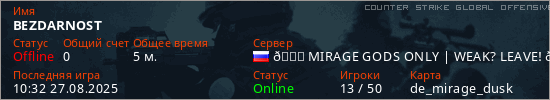 Играет на Counter Strike Global Offensive сервере. Страна: РоссияПервый раз замечен 10:30 27.08.2025