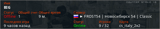 Играет на Counter Strike 1.6 сервере. Страна: РоссияПервый раз замечен 18:32 11.04.2026