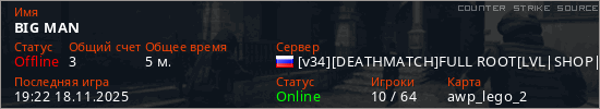 Играет на Counter Strike Source сервере. Страна: РоссияПервый раз замечен 19:18 18.11.2025