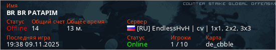Играет на Counter Strike Global Offensive сервере. Страна: РоссияПервый раз замечен 10:32 26.10.2025