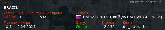 Играет на Counter Strike 1.6 сервере. Страна: РоссияПервый раз замечен 18:49 15.04.2025