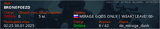 Играет на Counter Strike Global Offensive сервере. Страна: РоссияПервый раз замечен 02:20 30.01.2025