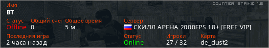 Играет на Counter Strike 1.6 сервере. Страна: РоссияПервый раз замечен 12:05 21.02.2026