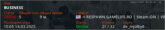 Играет на Counter Strike 1.6 сервере. Страна: СШАПервый раз замечен 14:34 14.03.2025