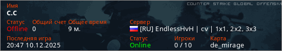 Играет на Counter Strike Global Offensive сервере. Страна: РоссияПервый раз замечен 20:25 10.12.2025