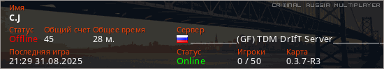 Играет на Criminal Russia Multiplayer сервере. Страна: РоссияПервый раз замечен 20:16 31.08.2025