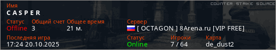 Играет на Counter Strike Source сервере. Страна: РоссияПервый раз замечен 00:07 06.02.2024