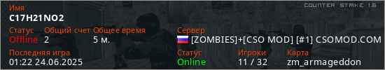 Играет на Counter Strike 1.6 сервере. Страна: РоссияПервый раз замечен 01:15 24.06.2025