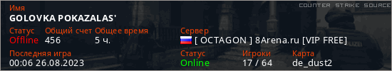 Играет на Counter Strike Source сервере. Страна: РоссияПервый раз замечен 17:51 25.10.2022