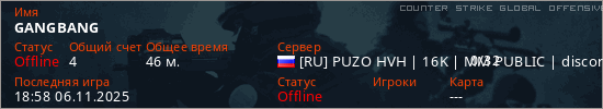 Играет на Counter Strike Global Offensive сервере. Страна: РоссияПервый раз замечен 15:12 17.10.2025