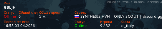 Играет на Counter Strike Global Offensive сервере. Страна: РоссияПервый раз замечен 16:40 03.04.2026