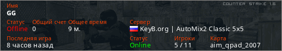 Играет на Counter Strike 1.6 сервере. Страна: РоссияПервый раз замечен 16:48 03.02.2026