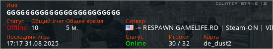 Играет на Counter Strike 1.6 сервере. Страна: СШАПервый раз замечен 17:08 31.08.2025