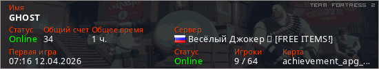 Играет на Team Fortress 2 сервере. Страна: РоссияПервый раз замечен 07:16 12.04.2026