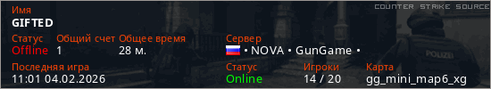 Играет на Counter Strike Source сервере. Страна: РоссияПервый раз замечен 10:15 04.02.2026