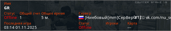 Играет на Counter Strike 1.6 сервере. Страна: РоссияПервый раз замечен 02:41 01.11.2025