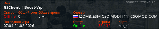 Играет на Counter Strike 1.6 сервере. Страна: РоссияПервый раз замечен 07:02 21.02.2026