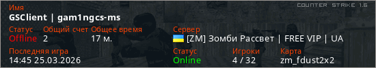 Играет на Counter Strike 1.6 сервере. Страна: УкраинаПервый раз замечен 11:52 17.03.2026