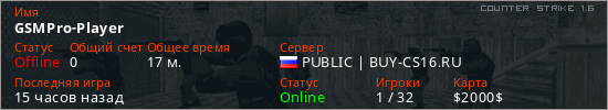 Играет на Counter Strike 1.6 сервере. Страна: РоссияПервый раз замечен 21:38 15.03.2026