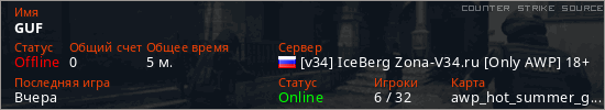 Играет на Counter Strike Source сервере. Страна: РоссияПервый раз замечен 19:17 25.12.2025