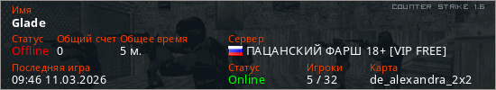 Играет на Counter Strike 1.6 сервере. Страна: РоссияПервый раз замечен 09:42 11.03.2026