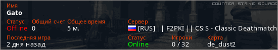 Играет на Counter Strike Source сервере. Страна: РоссияПервый раз замечен 09:07 02.02.2026