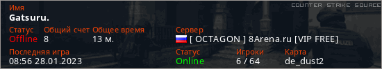 Играет на Counter Strike Source сервере. Страна: РоссияПервый раз замечен 08:46 28.01.2023