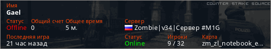 Играет на Counter Strike Source сервере. Страна: РоссияПервый раз замечен 14:52 19.04.2026