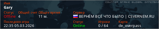 Играет на Counter Strike Global Offensive сервере. Страна: РоссияПервый раз замечен 15:00 05.03.2026