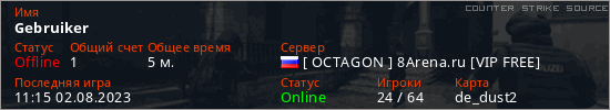 Играет на Counter Strike Source сервере. Страна: РоссияПервый раз замечен 11:04 02.08.2023