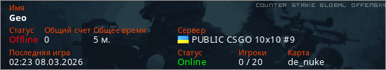 Играет на Counter Strike Global Offensive сервере. Страна: УкраинаПервый раз замечен 02:19 08.03.2026