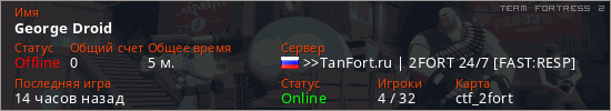 Играет на Team Fortress 2 сервере. Страна: РоссияПервый раз замечен 20:39 14.01.2026