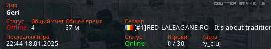 Играет на Counter Strike 1.6 сервере. Страна: РумынияПервый раз замечен 09:44 24.03.2023
