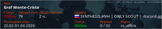 Играет на Counter Strike Global Offensive сервере. Страна: РоссияПервый раз замечен 14:35 22.03.2026