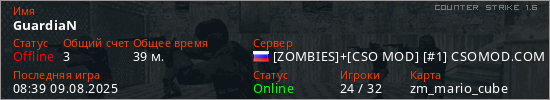 Играет на Counter Strike 1.6 сервере. Страна: РоссияПервый раз замечен 15:10 06.04.2025