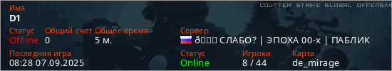 Играет на Counter Strike Global Offensive сервере. Страна: РоссияПервый раз замечен 08:18 07.09.2025