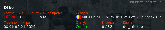 Играет на Counter Strike 1.6 сервере. Страна: РумынияПервый раз замечен 08:04 05.01.2026