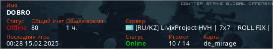 Играет на Counter Strike Global Offensive сервере. Страна: КазахстанПервый раз замечен 22:52 21.01.2025