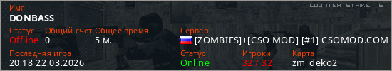 Играет на Counter Strike 1.6 сервере. Страна: РоссияПервый раз замечен 20:15 22.03.2026