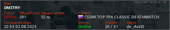 Играет на Counter Strike 1.6 сервере. Страна: РоссияПервый раз замечен 22:27 09.10.2022