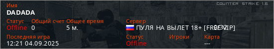 Играет на Counter Strike 1.6 сервере. Страна: РоссияПервый раз замечен 11:49 04.09.2025