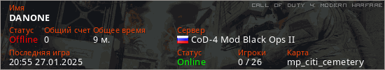 Играет на Call of Duty 4: Modern Warfare сервере. Страна: РоссияПервый раз замечен 20:12 27.01.2025