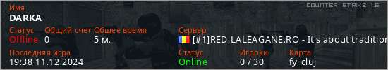 Играет на Counter Strike 1.6 сервере. Страна: РумынияПервый раз замечен 19:36 11.12.2024