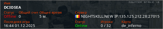 Играет на Counter Strike 1.6 сервере. Страна: РумынияПервый раз замечен 16:42 01.12.2025