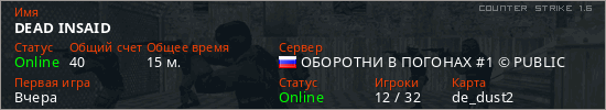 Играет на Counter Strike 1.6 сервере. Страна: РоссияПервый раз замечен 21:23 09.01.2026