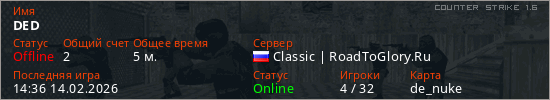 Играет на Counter Strike 1.6 сервере. Страна: РоссияПервый раз замечен 14:34 14.02.2026