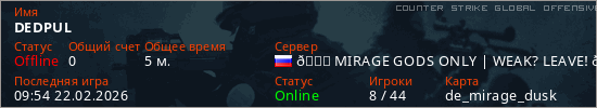 Играет на Counter Strike Global Offensive сервере. Страна: РоссияПервый раз замечен 09:45 22.02.2026